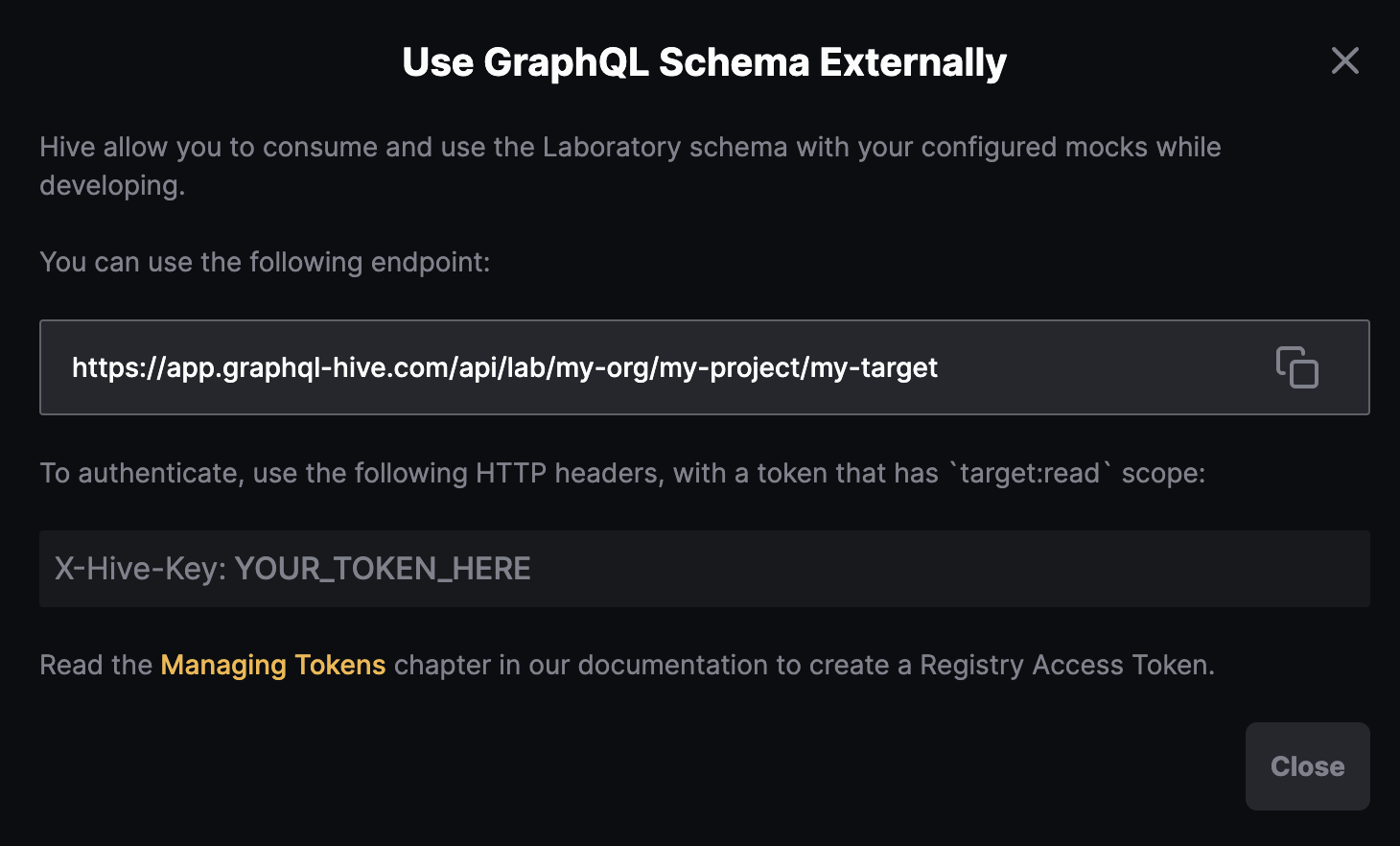 Hive allow you to consume and use the Laboratory schema with your configured mocks while developing, without running any GraphQL server or gateway.